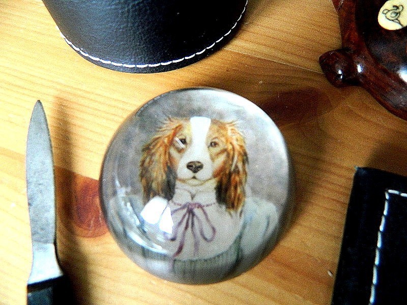 Presse papier Dame chien de petite taille, la dame est habillée en costume vert et ruban rose arborant un air sérieux.