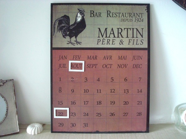 Ce calendrier perpétuel campagnard est réalisé en métal avec une impression représentant un coq indiquant "Bar Restaurant Martin Père et fils".